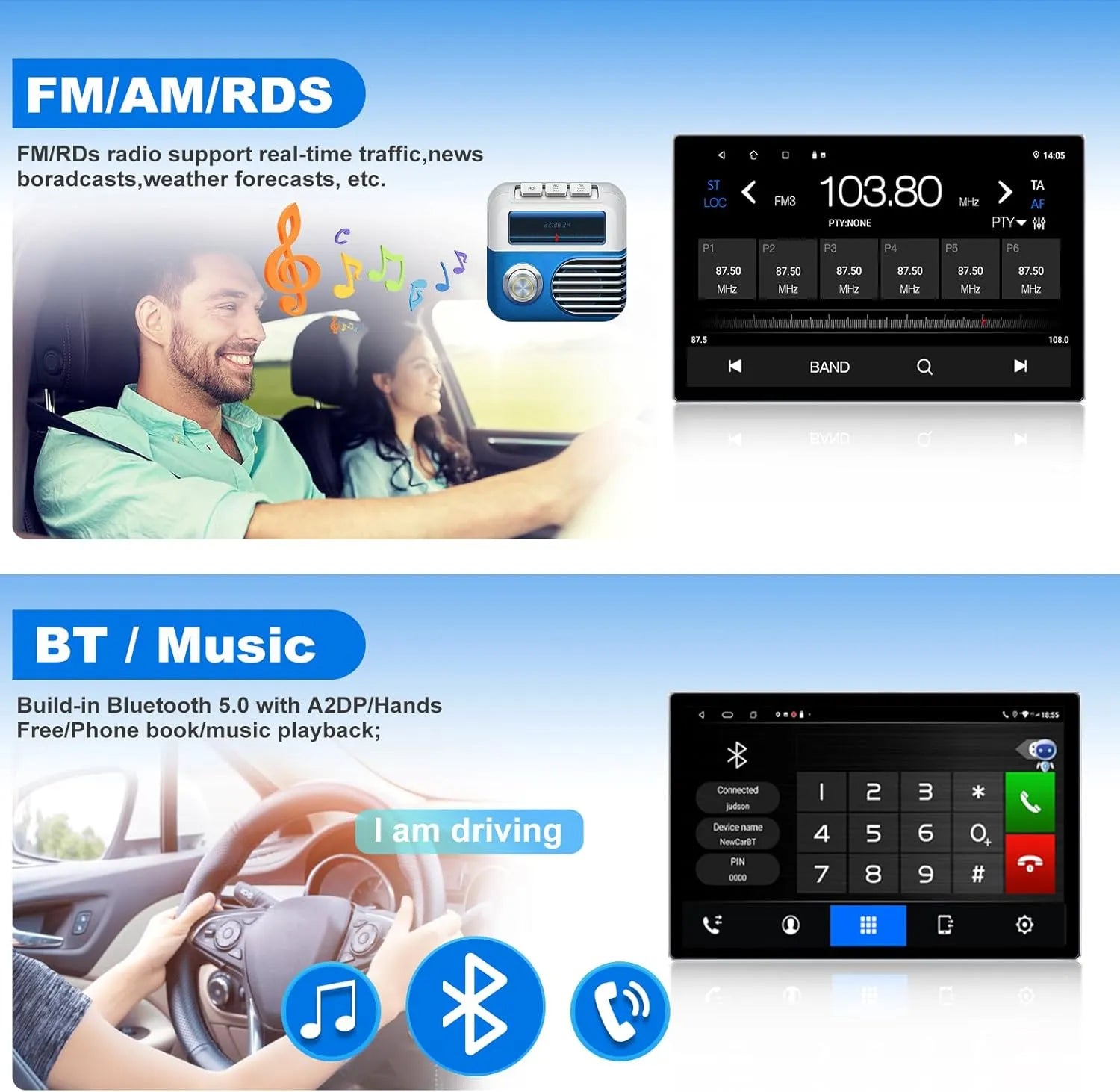- 🎵 Radio FM avec DSP (30 stations présélectionnables) et commandes au volant intégrées