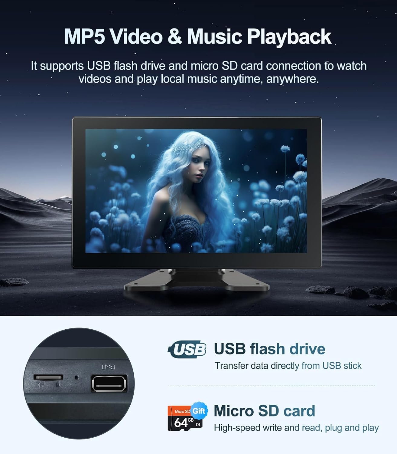 Carte micro SD 64GB incluse + port USB 2.0 pour stockage supplémentaire