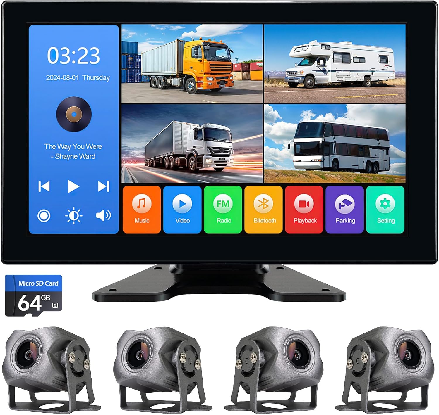 Kit Caméras 4K 1080P 4 Canaux avec Écran Tactile 10.2" pour Camions, Bus & Caravanes – Vision 360°, Enregistrement 5 Canaux, Étanche IP69, Bluetooth 5.0, Installation Facile