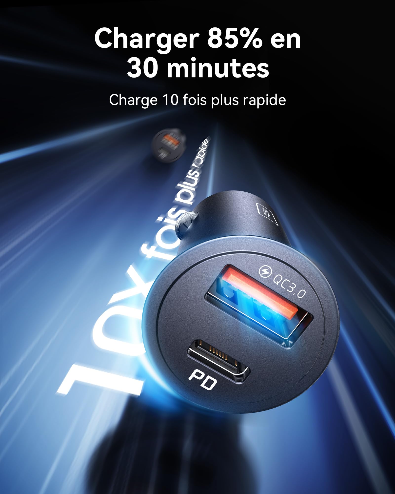 Chargez votre iPhone ou Samsung à 85% en seulement 30 minutes - 10x plus rapide qu'un chargeur standard.