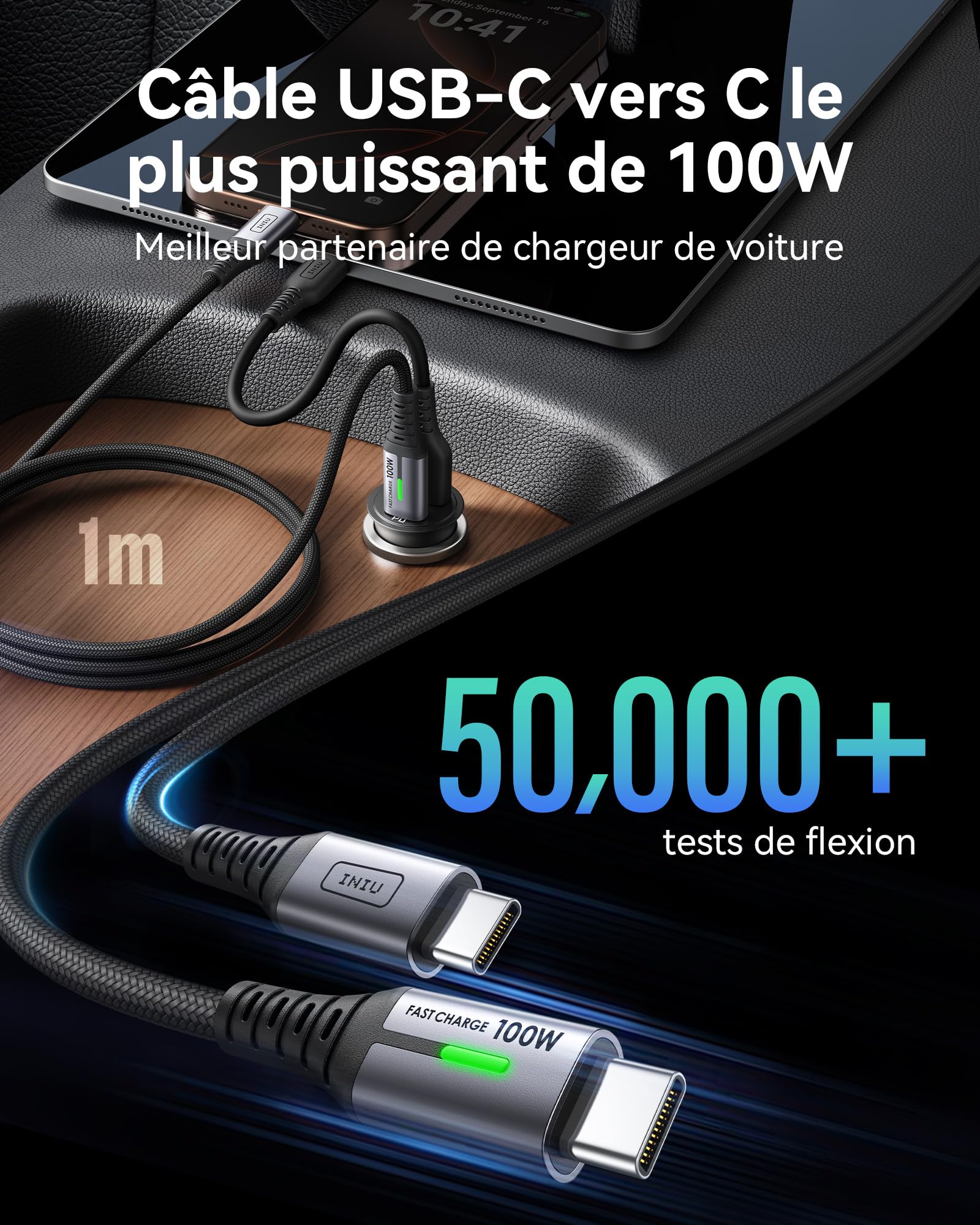 Le chargeur de voiture INIU 60W avec câble USB-C 100W de 1m garantit des appareils toujours chargés pour des trajets sans stress.