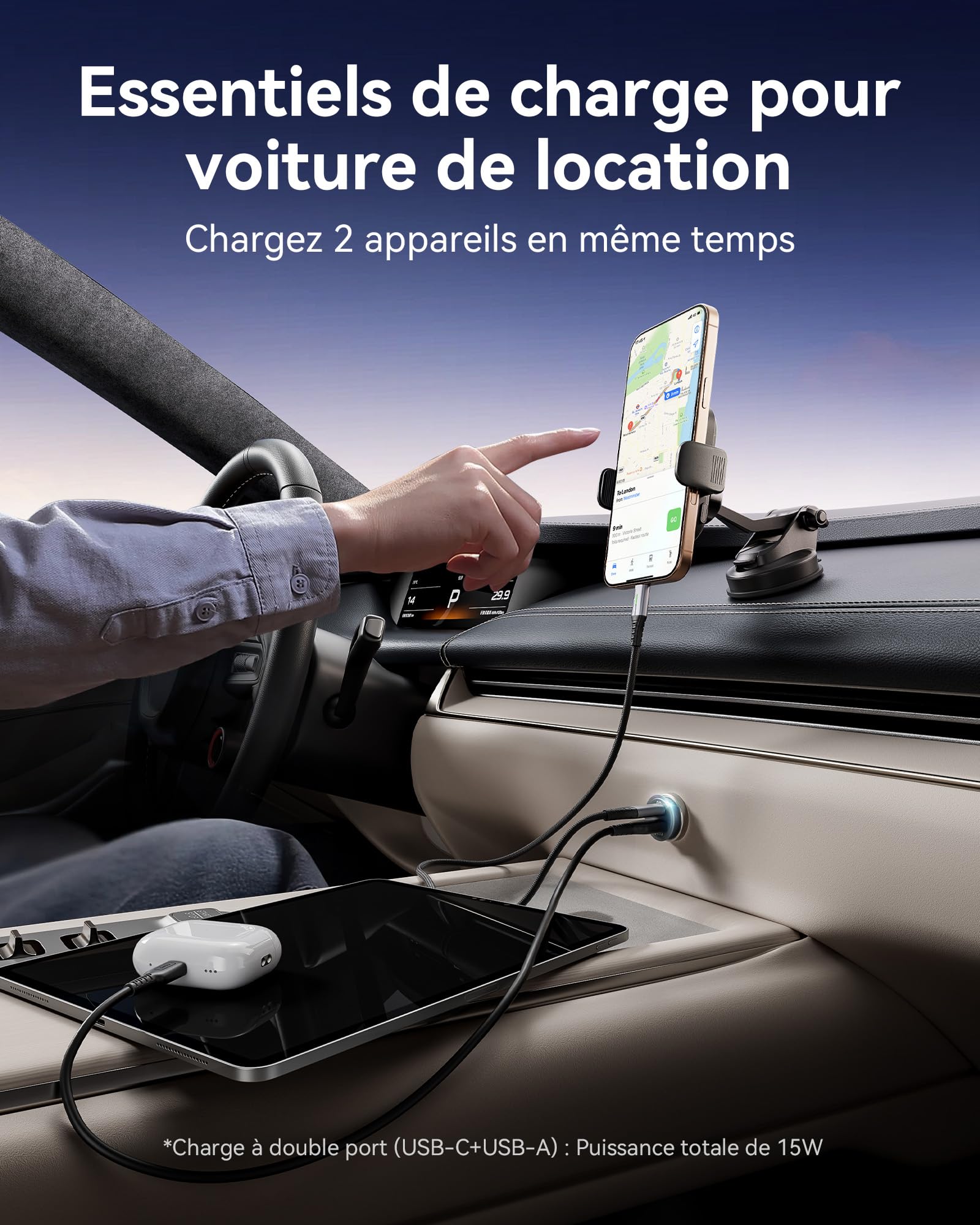 Avec ses ports USB-C et USB-A, chargez deux appareils simultanément dans les voitures de location aux options limitées.