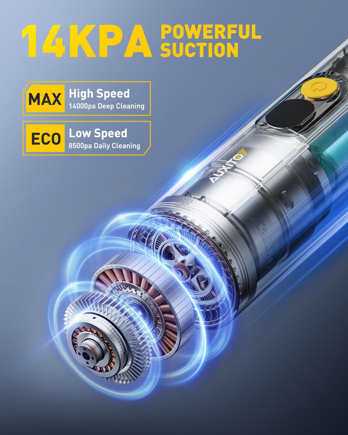 Moteur brushless haute performance offrant une aspiration de 14000Pa. Deux modes disponibles (8500Pa et 14000Pa) pour s'adapter à tous vos besoins de nettoyage.
