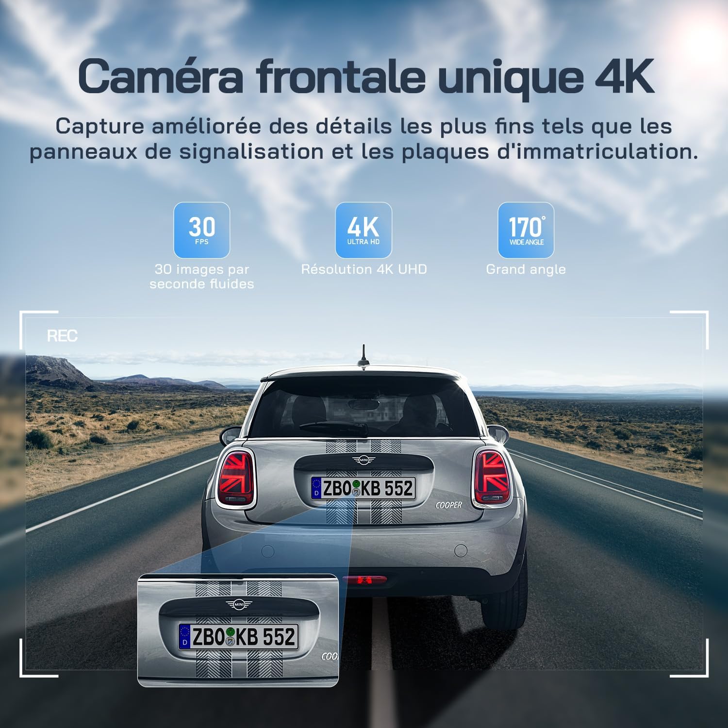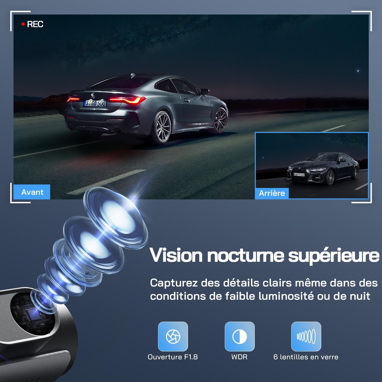 Cette caméra embarquée double capture la route en détail avec une résolution avant de 4K 2160P/30fps et une résolution arrière full HD 1080P. Son objectif grand angle de 170° et son ouverture F1.8 associés à la vision nocturne WDR garantissent des images claires même par faible luminosité.