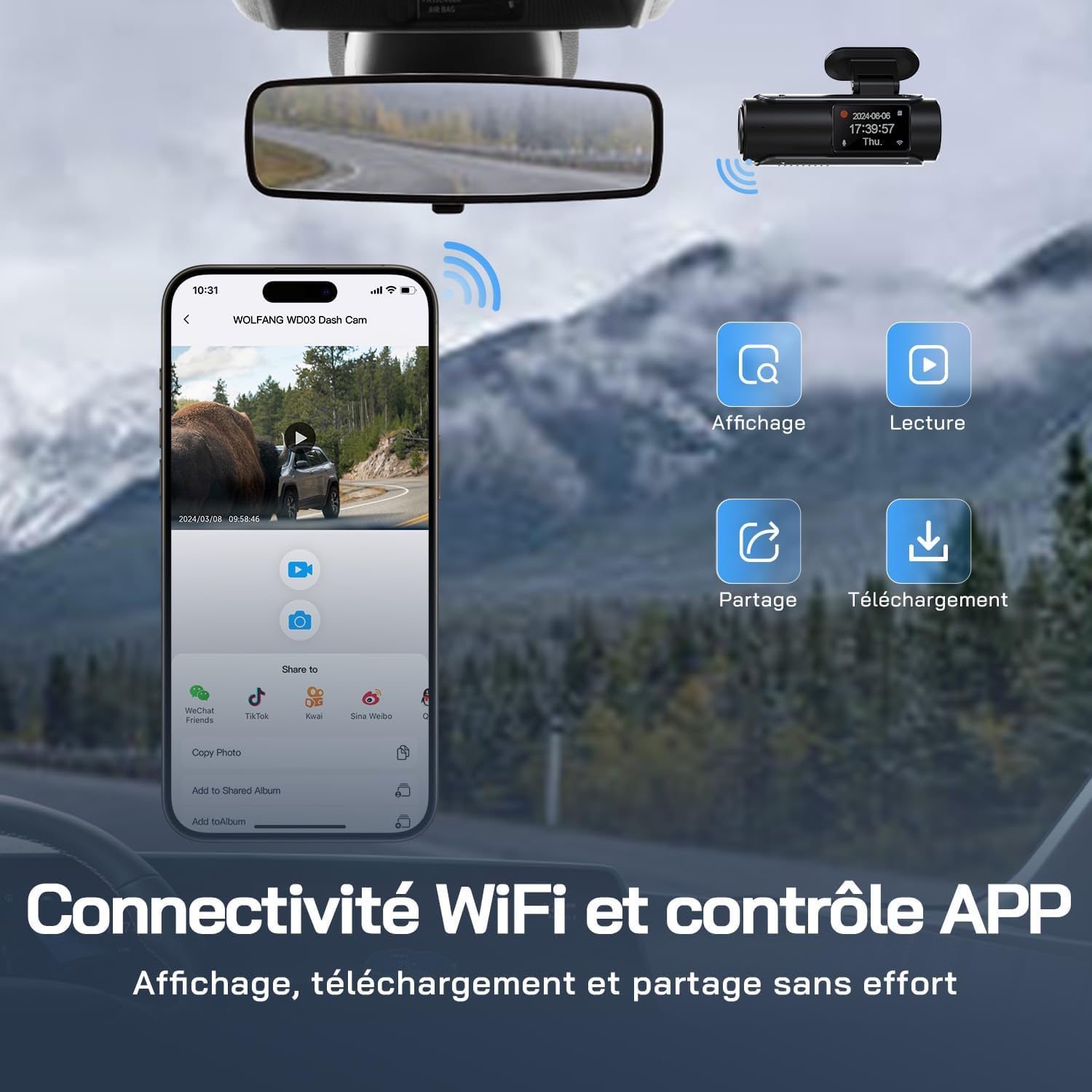 Le WD03 se connecte à votre smartphone via WiFi intégré (portée 3-5m). L'application dédiée permet de visualiser, gérer et partager vos vidéos directement depuis votre appareil iOS ou Android.